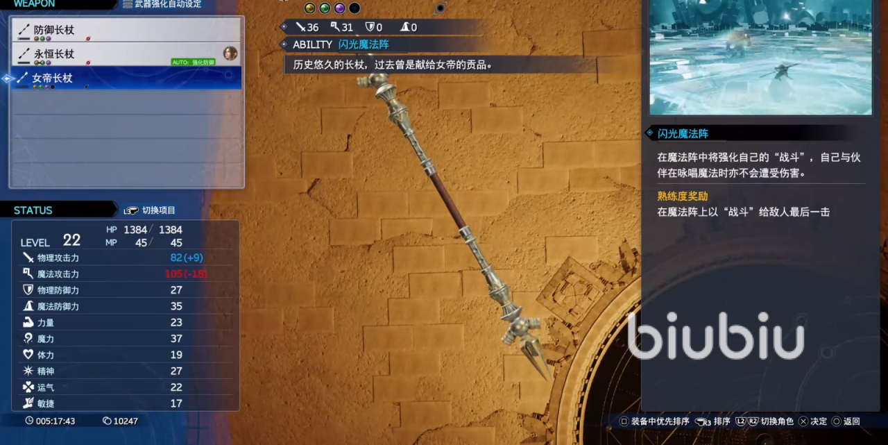 可以在爱丽丝房间内找到,作为过期敬献给女帝的供品,女帝长杖对的能力是释放闪光魔法阵,在阵中强化自身战斗,自己和伙伴在咏唱魔法时不会受到敌人的伤害。熟练度奖励:在魔法阵上以“战斗”给敌人最后一击。