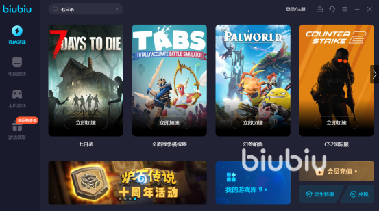 之所以小编给大家推荐这款游戏加速器“biubiu”,当然也是因为这款加速器不会让玩家玩游戏的过程当中有任何的卡顿,甚至是跳频等问题,它可成为电脑桌面助手。如果想要给游戏加速的话,通过下载到电脑上以后直接输入游戏的名字就可完成加速,游戏的类型包含多种多样,除了七日杀以外,全球的游戏类型都可使用这种方法有丝滑的体验。