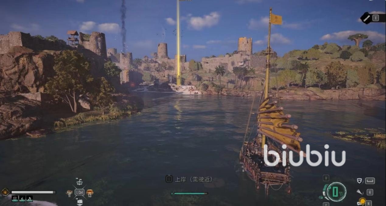 根据地图提示的线索,我们在上岸后需要向左边探索,一旦靠近宝藏,此处就会有提醒。当看见黄色光柱后,我们即可前往光柱所在地,按F键进行挖掘,获得失落的海民圣物。
