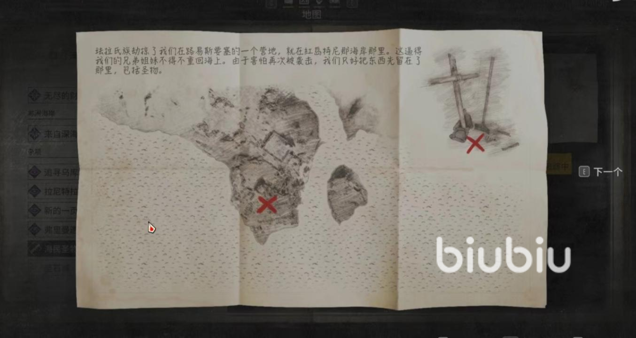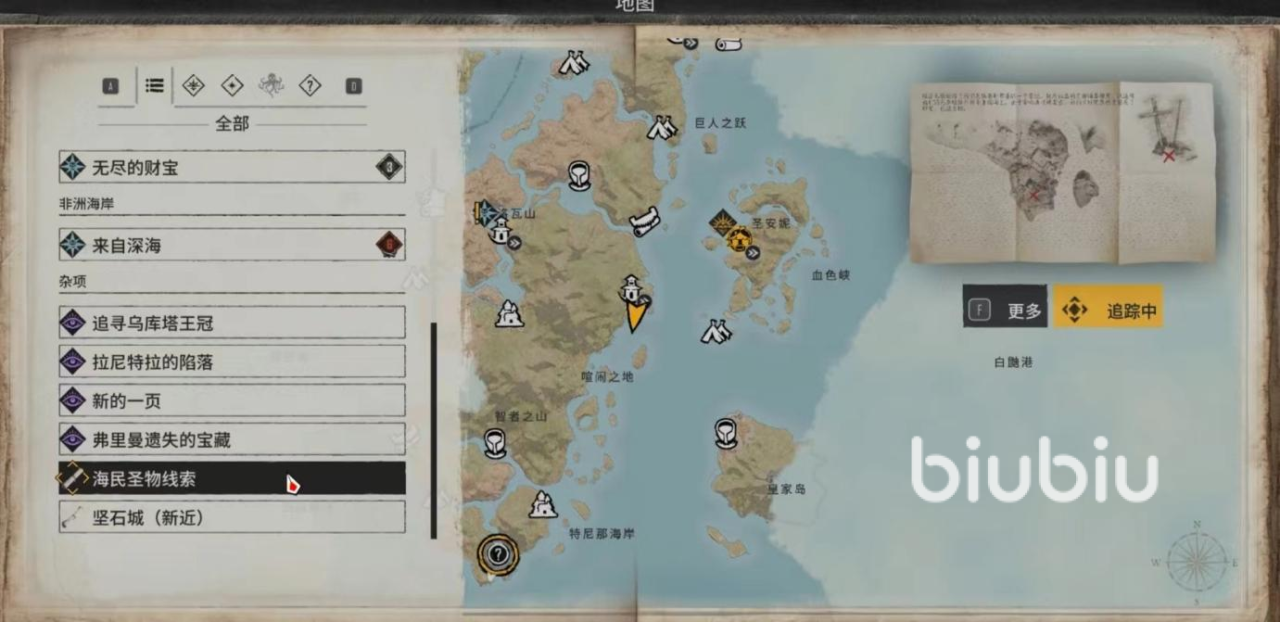 海民圣物需要玩家在游戏中的杂项任务里领取,点击追踪后会给玩家一份地图提示,这时会发现地图的左下角有问号提示,这里就是海民圣物的埋藏点。玩家需要来到路易斯要塞据点,解锁据点后将船只驶向岸边登上地面。