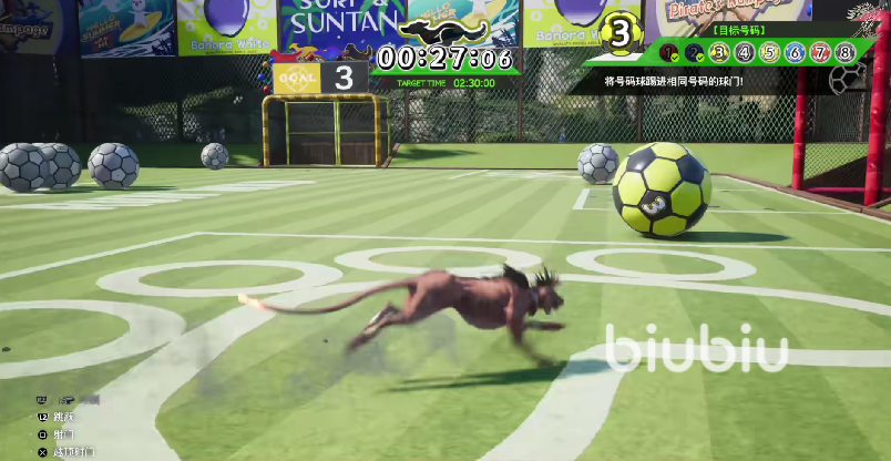 操作的方式也十分的简单,只要找到合适的角度,把球吊射进去球门就行了。我们按照顺序来,把1-8的球分别使用越顶射投进去。