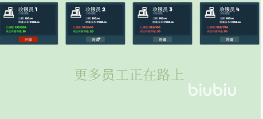 目前该游戏只可以最多雇佣四个收银员,但它们的解锁条件是不一样的。第一个要求是商店达到一定的等级,从10-20-30-50级进行递增。其次就是满足收银了多少笔的账单,最后既然是招聘人员,那肯定是需要支付工资的,如果入不敷出的话那也是无法雇他们工作的。