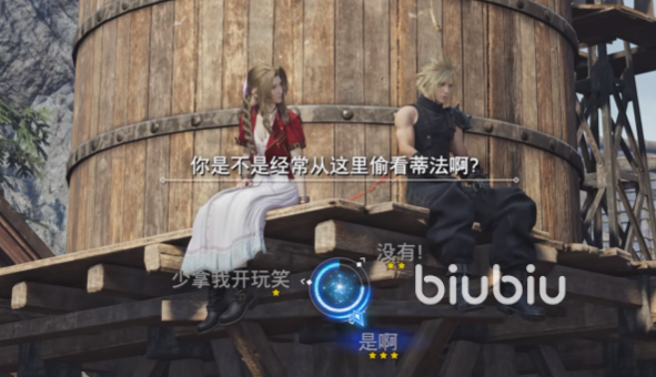 第 11 章回到村庄之后,主角进入自由活动环节,在广场上找到爱丽丝,然后跟她对话。当她问是不是经常从这里偷看蒂法,就如实回答“是啊”