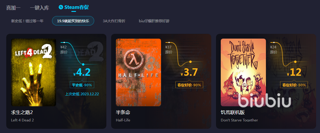现在biubiu还给大家额外赠送免费的steam游戏,点击游戏领取功能就能看到正在做活动的游戏,感兴趣的话就根据系统指引来领取。同时软件还为大家收集目前在steam上打折做活动的游戏,不同游戏的折扣已经罗列出来了,价格对比十分明显,其中的19.9专区跟biu仔推荐板块的都是便宜又好玩的游戏,有需要的小伙伴千万不要错过。