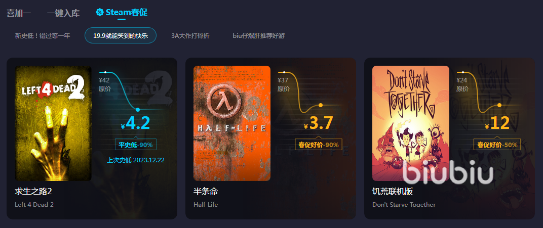 近期有意向购买steam游戏的小伙伴,不妨看一看biubiu为大家准备的春促活动合集。在合集里面有史低推荐、19.9专区等等,每款游戏的折扣幅度都为大家标明清楚,现在下手十分划算,平时买一个游戏的价格现在就能买两三个甚至是更多的游戏,千万不要错过。