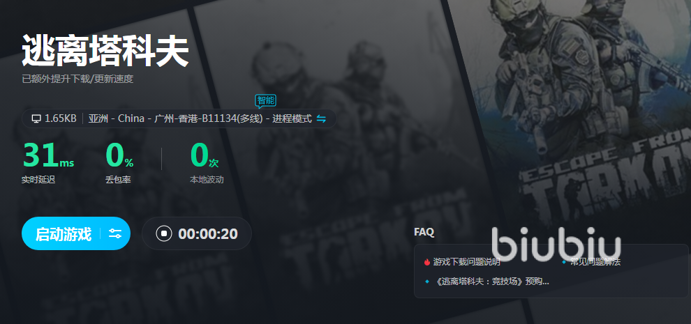 在玩逃离塔科夫的时候,大家需要有非常灵敏的反应,并且要具备成熟的战术思维,设计好了战术如果因为网络延迟发挥不出来就太可惜了。大家直接在biubiu里搜索游戏,然后开启一键加速,这样就能享受到优质的网速了。