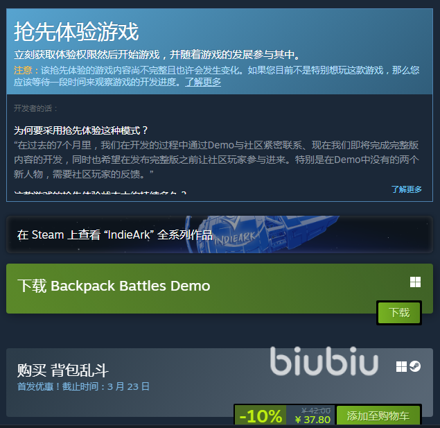 目前该游戏已经于3月8日正式上架到了steam平台上,虽然游戏目前处于抢先体验版,但是它也有准备贴心的DEMO版本供大家游玩,现在它还有首发折扣可以享受,只需要花费38元不到的价格就可以拥有它了,如果你不确定游戏喜欢与否的话,那就先体验下试玩版。