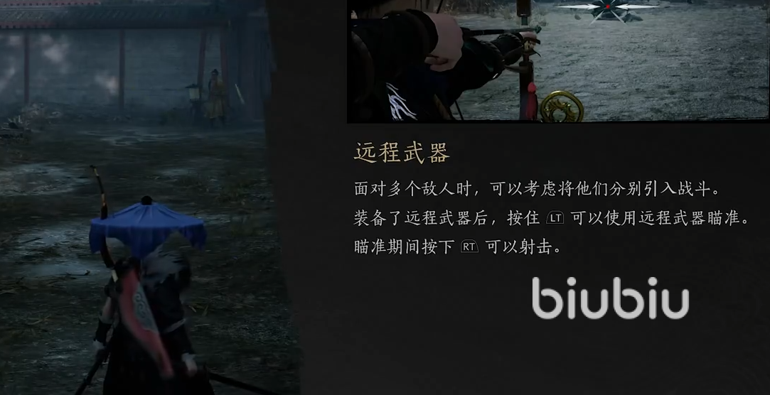 远程武器使用的场景是需要将多个敌人分别引入战斗的时候用,装备弓箭以后使用LT瞄准RT射击。