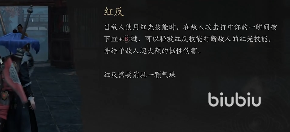 “红反”是游戏的特殊机制,我们在敌人释放技能打中我们的瞬间按下RT加B就可以打断敌人施法并给予他们巨额伤害,此时会消耗一颗能量球。