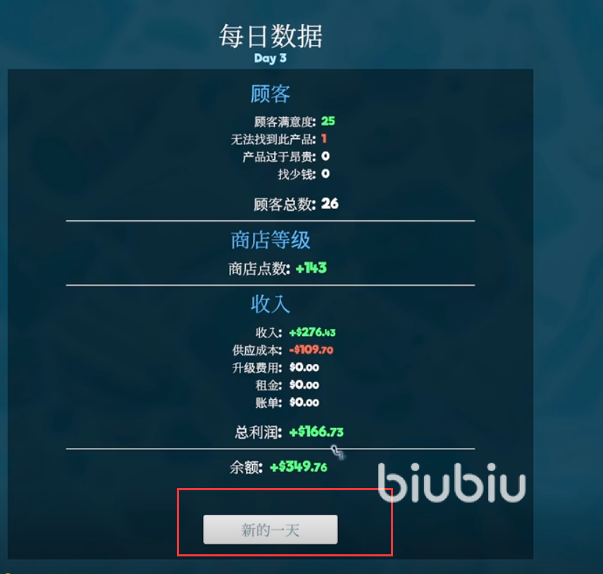 结束营业后在汇总的数据中,玩家可以看到今天的数据。在每日数据的最下面可以看到一个“新的一天”按钮,点击这个按钮就可以进入下一天了。