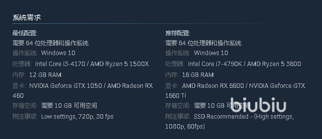 本作上线XBOX和Steam两大平台,主机是固配配置这里也没必要多说了,机器买回来肯定是能带动的。而PC版目前也已经公布参数,需要Windows10以上系统才能进行兼容,硬盘则需要至少10GB。