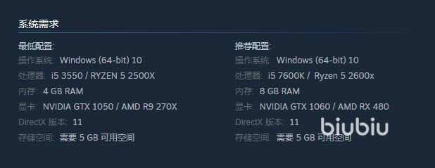 本作的配置要求其实不是很高,官方也写的比较简略,首先是Windows10以上的操作系统,再者就是5GB的硬盘空间。其余方面低配和高配略有不同,但差距也并不是很大,放今天来看不是太老的电脑都能达到。