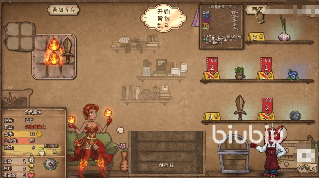 接着进入排位以后,我们要注意屏幕的左边,这里我们能看到人物的属性、回合数、胜利所需奖杯数以及可以尝试的次数等,然后鼠标放在右上角的商店那里可以看到不同物品出现的概率,游戏内道具的等级总共分为普通、罕见、史诗、传说以及神级,越好的道具前面出现的几率也就越低,概率是会随着回合数的增加而递增的,此外商品还有机会出现打折,这样我们就能以更低的价格买到需要的物品,不过这是随机的并不固定,右下角的箱子我们是可以出售不需要的物品的,在战斗开始之前可以将金币用完。