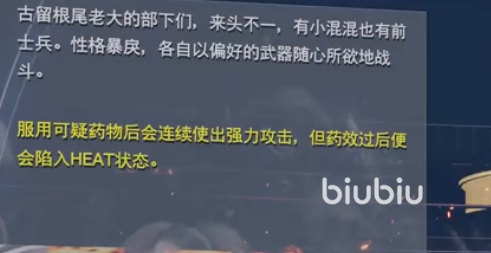 在开场白结束以后我们会面临古留根尾的部下们,他们都服用了可疑的药剂,这能使他们发挥出比平时更强的实力,但是药效过后他们就会陷入heat的状态。这其实就和用力过猛虚脱了意思一个道理,在游戏内的表现是倒地并削弱自己的属性,受到的伤害也会变得更多。