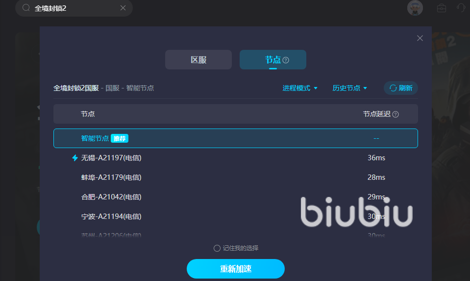 另外在玩国际服的时候,玩家也可以根据自己的爱好去挑选不同区服,就连节点都可以自由挑选,如果实在不知道用什么,biubiu的智能节点功能也是能够起到作用的,直接给玩家挑选好。