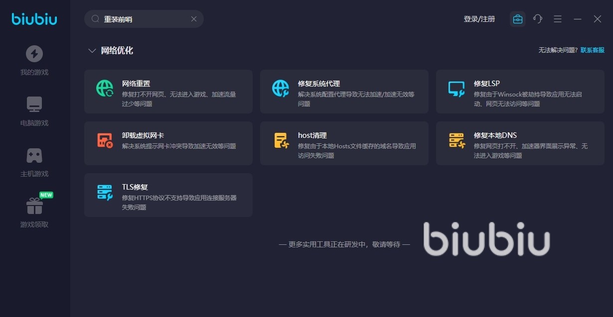 很多玩家的网络问题并不是简单的网络不好,而是自己胡乱设置跟下载了太多的软件,导致冲突让自己的网关配置出了故障,这些专业的问题就要交给专业的biubiu来解决。直接找到首页的百宝箱,里面有各种情况的解决途径提供给大家,一个一个试过去,总能够搞定故障。