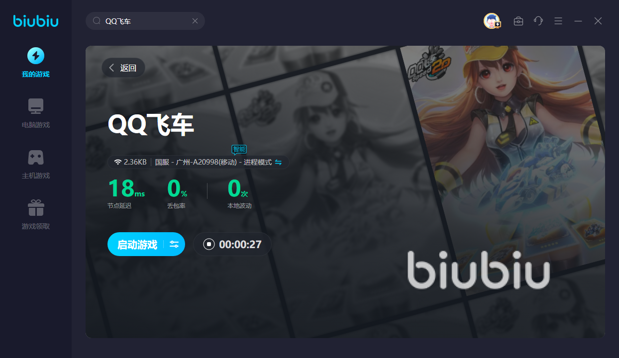 若是游戏时闪退的话,再次登录游戏就已经结束了,让你直接判负。这时便可在biubiu的帮助下,极大程度地减少游戏掉包率,可以稳定地跑完每一场对局,防止掉线。接着还可跟别人组队并开启语音,这时对网速要求更高。这款加速器即可提供更高速的网络环境,令你赛车的时候也能顺畅地进行语音对话,防止卡住。接着加速步骤也极其简单,仅需找到QQ飞车后,即可点击加速。若是想玩其他赛车游戏,点击暂停后,便可继续为其他游戏提速。