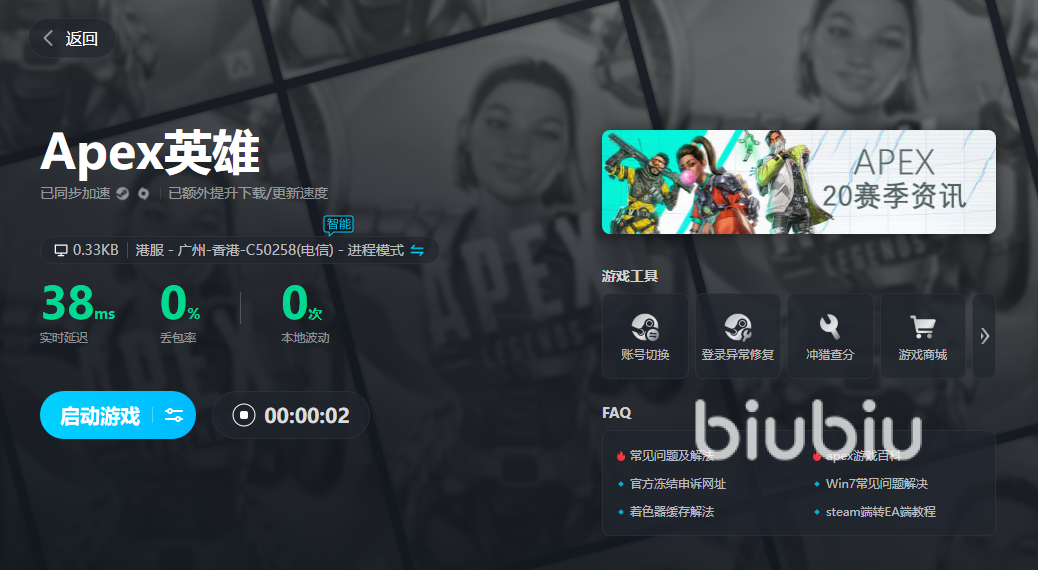 2024年03月26日 16:22 来源:突袭多饺子apex是一款很考验玩家配合的射击类型的大型游戏,但是很多玩家都会出现apex闪退报错的情况,小编也不例外。这款考验战术配合的游戏而且还是免费游戏,吸引而来的玩家也是非常多的。但是闪退的毛病也是劝退了很多玩家,小编不想各位玩家错过这款优秀的游戏,因为解决办法比较简单,小编在这里普及一下,下载一款游戏加速器就可以解决这个疑难杂症。小编在这里给大家推荐的是biubiu加速器,这也是小编从各大游戏加速器平台中找到的一款性价比的游戏加速器。