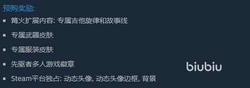 除此以外所有预购的玩家们,不论购买什么版本都会获得专属的吉他旋律和故事线、特定的武器和服装皮肤、先驱者多人游戏的徽章,同时还能再额外获得steam的动态头像、边框栏以及背景,这就能够彰显出我们的个性了,还是比较不错的。