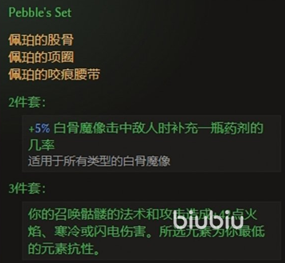 分别是股骨,项圈跟咬痕腰带这三个。集齐2件就可以提升很大的效果,在白骨魔像击中敌人的时候,补充一瓶药剂的几率会增加5%,而且是所有类型的白骨魔像都可以享受这个加成。3件套的时候就可以提升召唤骷髅的攻击力,法术以及攻击效果都可以增加42点伤害,在火焰、寒冷以及闪电当中,角色哪个元素抗性最低就会取哪个。