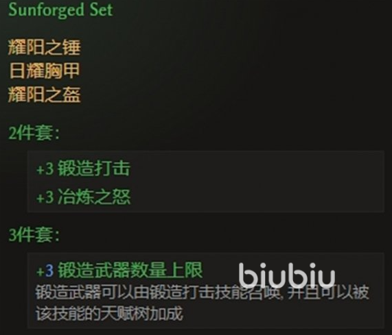 分别是耀阳之锤跟耀阳之盔,再加一个日耀胸甲,2件套的时候可以加3级的锻造打击以及冶炼之怒,集齐了3件就可以提升锻造武器的数量上限,最多增加3个。这个锻造武器起到的效果还是很有用的,使用锻造打击技能就可以召唤,并且还受到这个技能的天赋树加成。