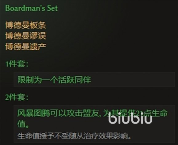 这个分别是板条,谬误以及遗产这三个装备,穿上一件就有效果了,但是只可以有一个活跃同伴。2件的时候就可以召唤风暴图腾,给盟友施加提升21点生命值的效果,但是这个值是不受到治疗效果影响的。3件的时候就可以为盟友提供21点的护盾能力,集齐就可以全方位的辅助成员。