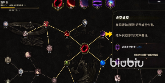 首先,我们先点设置,将显示敌方生命条,玩家生命条点出来,这样打起来,我们比较好观察,能看到对方的血量和我们的血量。然后,关于骑士比较常见的流派推荐虚空骑士。带上旋风斩和虚空顺劈斩,还有与之互动的深渊回响。在旋风斩的加点方面,如果我们前期主点解开枷锁,想一直转的话,那么就会出现伤害不够的情况,所以放弃省蓝,只走伤害。