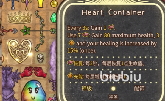 心之容器的效果简单来说就是提供再生,以及消耗7点恢复,获得3点充能。80的血量上限以及生命回复速度。可以搭配游侠专属的幸运,可以开局就触发这个效果。