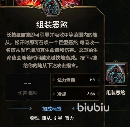 长按该技能之后中等范围内的仆从就会被吸收,然后组装成为一个巨型的恶煞,每次吸收一个就可以提高其生命值跟伤害。需要注意的是召唤后它存在的时间会非常的短,我们一旦使用就需要掌握好时机。