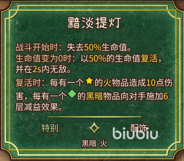 灰烬使者:战斗开始就会拾取50%的生命值,生命归0时会以50%的血量复活,并在2秒内进入无敌状态。复活时每有一个带星号的火物品就可以对敌人造成10点伤害,每有一个方形的暗黑物品就会对对手释放6层减益。有点像lol中的塞恩,在死亡后获得一个高额的输出。
