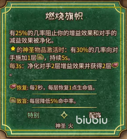 十字军:有25%的几率阻止自己的增益效果和对手的减益效果被净化。当带有星号的神圣物品被激活时,会有30%的几率给对手上一层致盲,持续5秒。除次之外每3秒可以进化对手2层增益效果,而自身获得2层的恢复。比较克制各种依靠增益手段来提升伤害的流派。