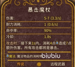 暴击魔杖是由魔杖跟橡子颈圈合成得到了,伤害数值范围是5-7,秒伤核算下来差不多3.3。耐力消耗是1,平均下来每秒消耗差不多0.6。命中率还算不错,达到了90%。冷却时间为1.8s,这个属于中等水平,用起来攻速还可以接受。