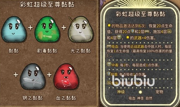 黏黏也是一个不能缺少的辅助道具,刷到就拿下肯定没有问题的,它还可以跟其他道具合成,一般能拿到3个就算不错了,用在这个流派当中的可以使用光之黏黏以及钢之黏黏,其他的就不是特别的匹配。如果运气好能够合成至尊的彩虹黏黏,那所有的效果都可以享受到,加成是非常大的。