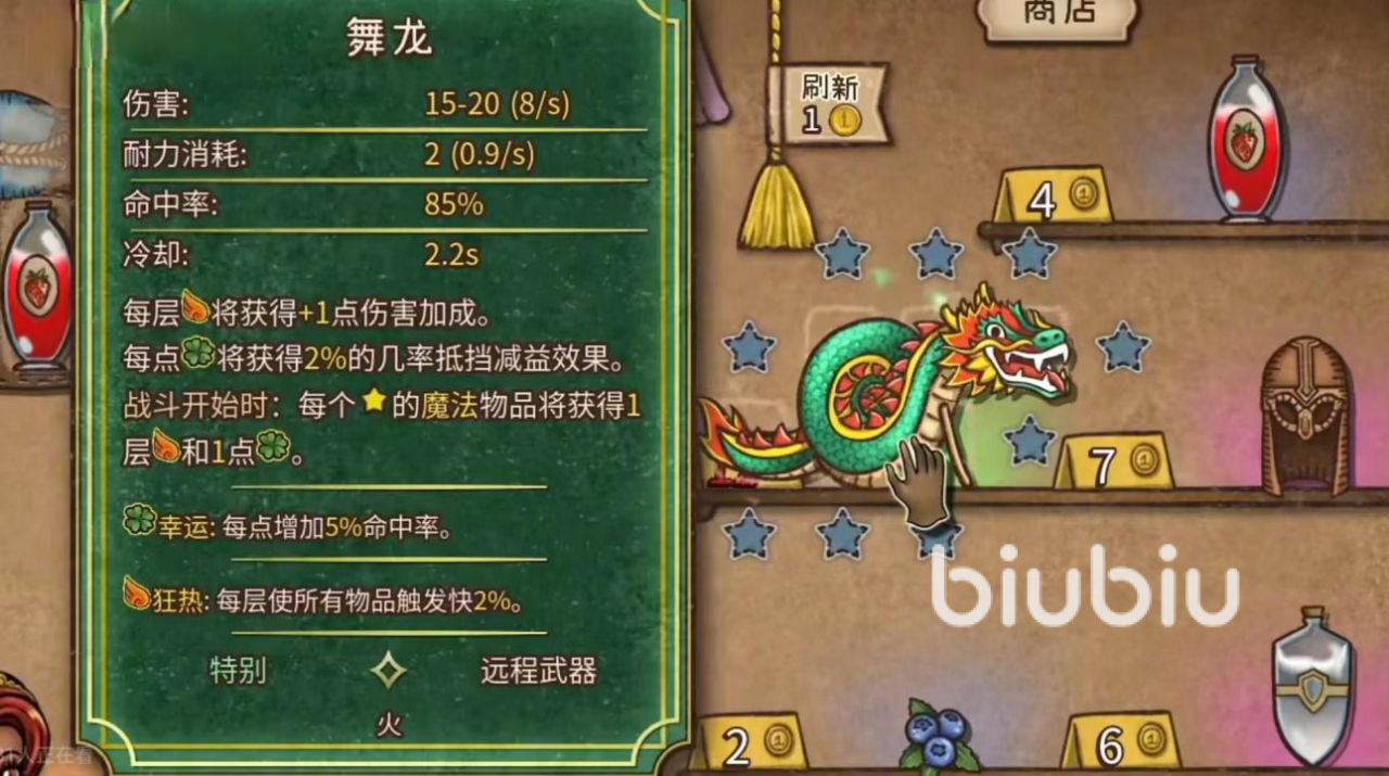 舞龙的具体属性是伤害15-20(8/s),耐力消耗2(0.9/s),命中率85%,冷却2.2s,玩家每获得一层狂热将获得1点伤害加成,每获得一层幸运将获得2%的几率抵挡减益效果。当战斗开始时,每个*的魔法物品将获得1层狂热和一点幸运,幸运属性每点增加5%命中率,狂热属性每层使所有物品触发快2%。