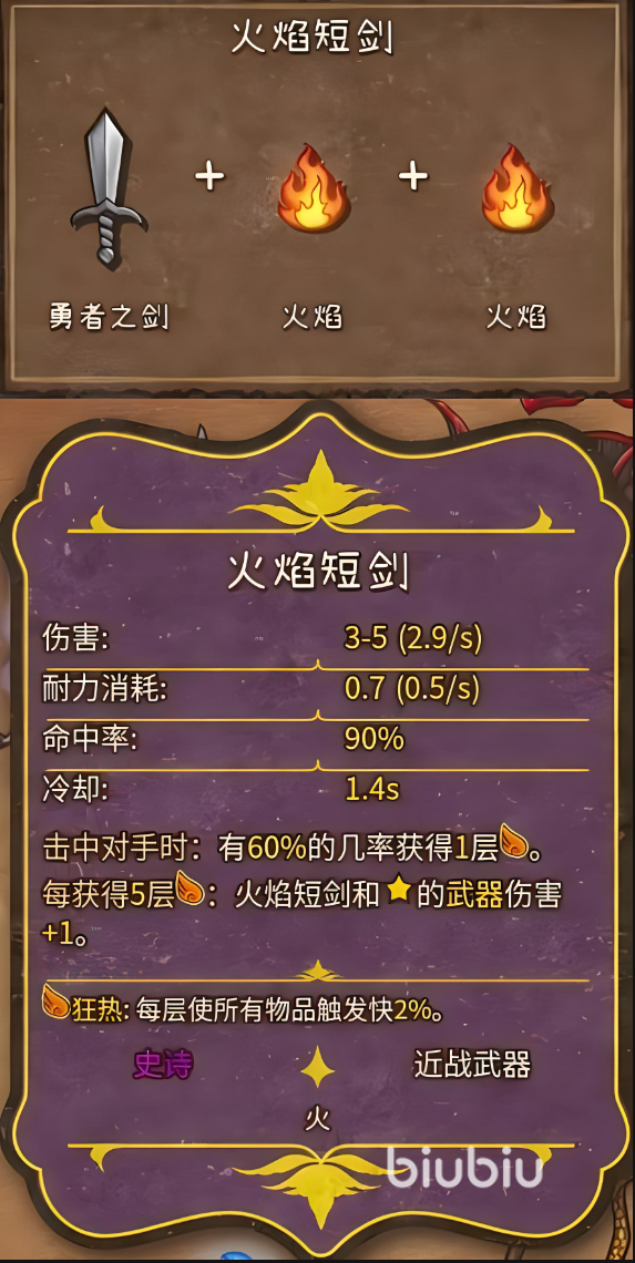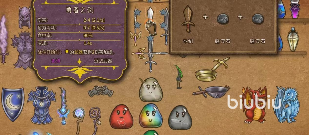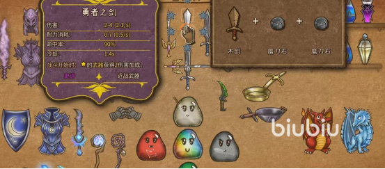 勇者之剑在背包乱斗中作为许多高级道具的基底,首先木剑和两个磨刀石即可合成。耐力的消耗虽然只有0.7,但命中率却有90%,前期的每秒伤害只有2.1,冷却时间也是比较长的1.4s,但好在对局开始前武器的伤害可直接获得加成。