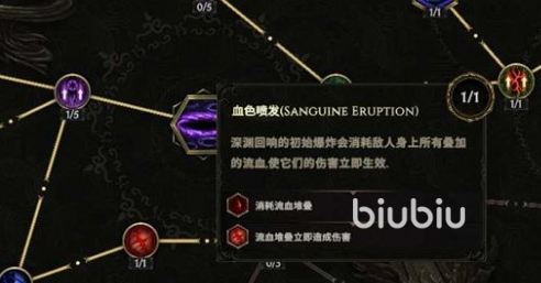 在点击技能的时候,要点盾牌投掷分类当中的显化灵感,这样就可以利用高频率的攻击来叠加流血状态。流血状态可是可以依靠深渊回响这个技能分类里面的血色喷发来引爆,这样就可以立马造成大量伤害,刷怪手感还是很不错的。