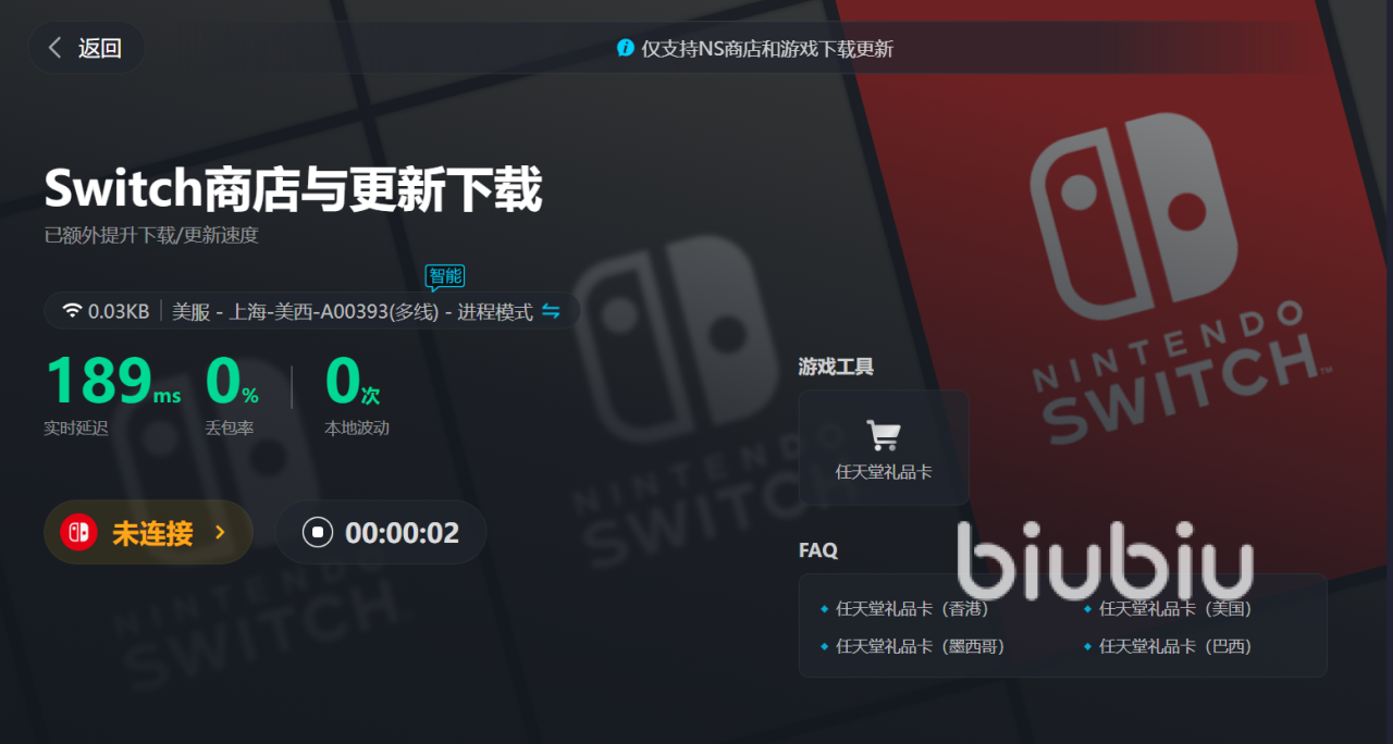 通过双人成行的这款游戏给大家举例子,平台上该游戏的忠实粉丝有很多,精致立绘和炫酷的操作真的是让玩家有种身临其境的感觉,不过当遇到线上人数增多的情况,网络卡顿和延迟就会频繁的出现,严重影响了游戏体验,这个时候可以进入biuibiu输入游戏名称选取对应区服或者是switch商店来优化加速。
