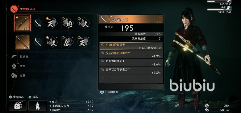 而战斗方面游戏安排了九种冷兵器,并且每个兵器都有数种流派,每种流派又有不同的架势,打斗变化极其丰富,也使得该作的技能树十分庞大,但在一开始玩家基本没那么多资源去加点以及获得兵器,你只能选个一两种去玩。在被击败时依然会掉落未消耗的经验点,也就是一般玩家所说的掉“魂”,但本作已经完全RPG化,很难将其归类为魂like游戏了。