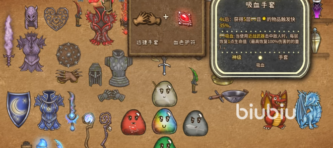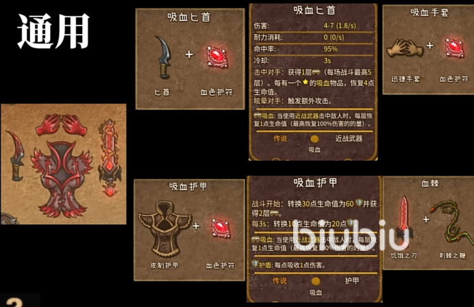 在背包乱斗中,不同的职业有自己的专属背包,其提供的效果也是不一样的。一般常见的通用装备有吸血类的道具,比如匕首、护甲、手套以及血棘。这类装备的合成方式非常简单,最核心的都是血色护符,以它为基础再加上所需的手套、护甲这些需要合成的部位道具就能完成了。