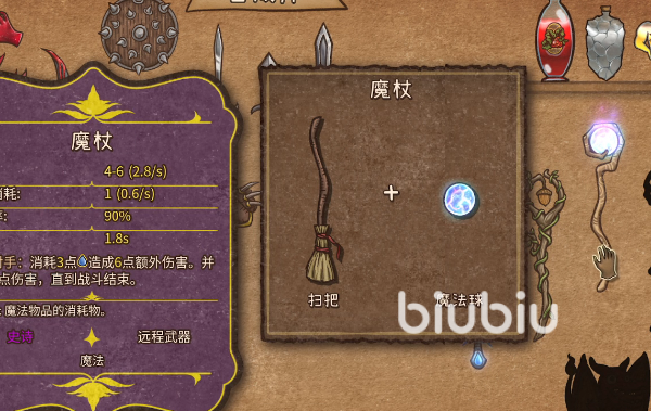 魔杖是一把史诗级品质的远程武器,它在击中对手时能造成六点到八点的伤害,每次释放需要消耗三点魔法值。它是由扫把和魔法球合成,这把武器与游侠这个职业是极其适配的,经常用于幸运魔杖流。在游戏的前期如果看到粉色小猪和四叶草直接购买,并且尽早将扫把拿到手。我们到转职之前的任务就是合出钢之黏黏,期间遇到木剑和盾牌可以先入手进行过渡。