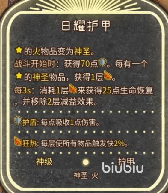 他的合成方式也是非常简单的,只需要一个神圣护甲加上两个火焰就可以合成。佩戴后其提供的护甲属性也是非常不错,在战斗开始的时候就可以获得70点护甲。像火法师这种需要通过火焰去输出的,它还有额外效果。每有一件神圣物品就可以获得一层火焰,每3秒还会消耗一层火焰来获得25点的生命值回复和移除两层减益效果,能抗的同时还伴有生命回复。而且每层火焰可以使所有物品触发快2%,像狂战士这种吃攻速的也是比较合适的。