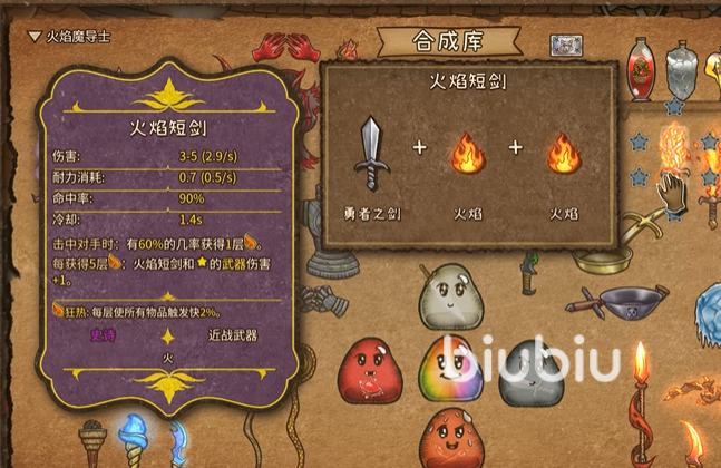 火焰短剑是由勇者之剑加两个火焰去进行合成的,火焰短剑的效果是每次命中对手都有60%的概率获得一层火焰,每获得5层火焰还能增加自身的伤害。我们需要去做两把火焰短剑这样可以互相去增加伤害。