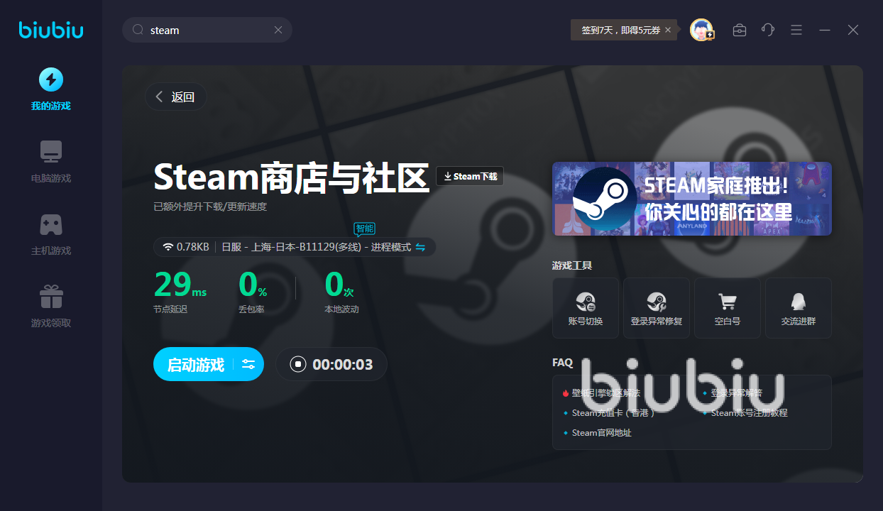 游戏分为四大阵营,玩家将在17张地图中进行厮杀,大大丰富了可玩内容,每一张地图的地形和状况都有很大差异,玩家必须熟练掌握各个地图关键点,才能够战胜敌人。同时还加入了多种不同兵种,包括特种部队,狙击兵,工兵等,让玩家在联机的过程中可以有更加详细的兵种配合,所以说联机玩法是战地2的精髓所在。为了能够在联机过程中更加顺畅,解决闪退这样的问题,biubiu加速器是小编推荐给大家的工具。这款游戏目前在steam上就可以直接购买和下载体验,所以使用biubiu优化的时候也需要先去加速steam平台,然后在这里直接打开游戏客户端,就可以享受到优化后的网络了。