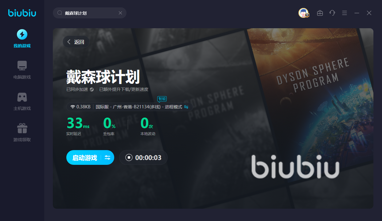 戴森球计划是款自由度特别高的游戏,有时可出发征战宇宙,但太卡的话,有可能被对手反打并消灭。此刻可利用好biubiu,有了它即可畅享极速网络,轻松解决宇宙中的各种怪物。该游戏目前加速限免,若是打算体验其他模拟游戏的话,新用户可领取24H的免费加速。此外,所有人都能使用【biubiu不卡顿】,即可畅享三天免费加速。另外当你想要与朋友一起匹配玩耍的话,网络延迟太高则会延缓进度,甚至导致队伍解散。在biubiu的协助下,即可降低延迟,轻松匹配你所需要的队友,从而更好地进入别人的世界,开启太空之旅!
