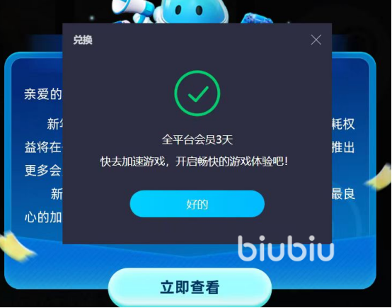 如今biubiu加速器除了在国内有着很高的知名度以外,它的下载量也在不断的增加,都是因为这款加速器现在有免费的加速时长福利,其中对于新用户来说可享受的加速时长高达96个小时,新用户注册官方就会直接赠送24小时。另外一个加速时长获得的方法是针对新老用户的,具体的方法就是输入兑换码【biubiu不卡顿】,领取免费三天加速时长。
