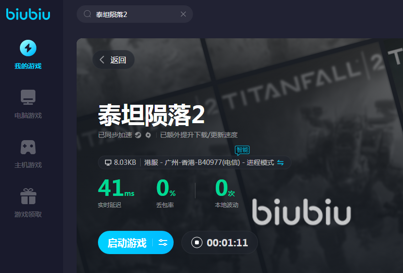 大家在biubiu里找到泰坦陨落2以后,想玩游戏随时都可以启动加速了,它拥有智能节点自动选择节点跟线路,用户对效果不满意的话也可以手动无感切换节点。biubiu每次的加速响应速度都很快,带来的效果也十分显著,网速轻轻松松就能达到KB速度,不管是玩游戏还是更新版本都很流畅。用biubiu加速后的网络来玩游戏是不容易掉线的,大家可以在泰坦陨落2里面自由操作机甲,挑战惊险刺激的机甲战斗。