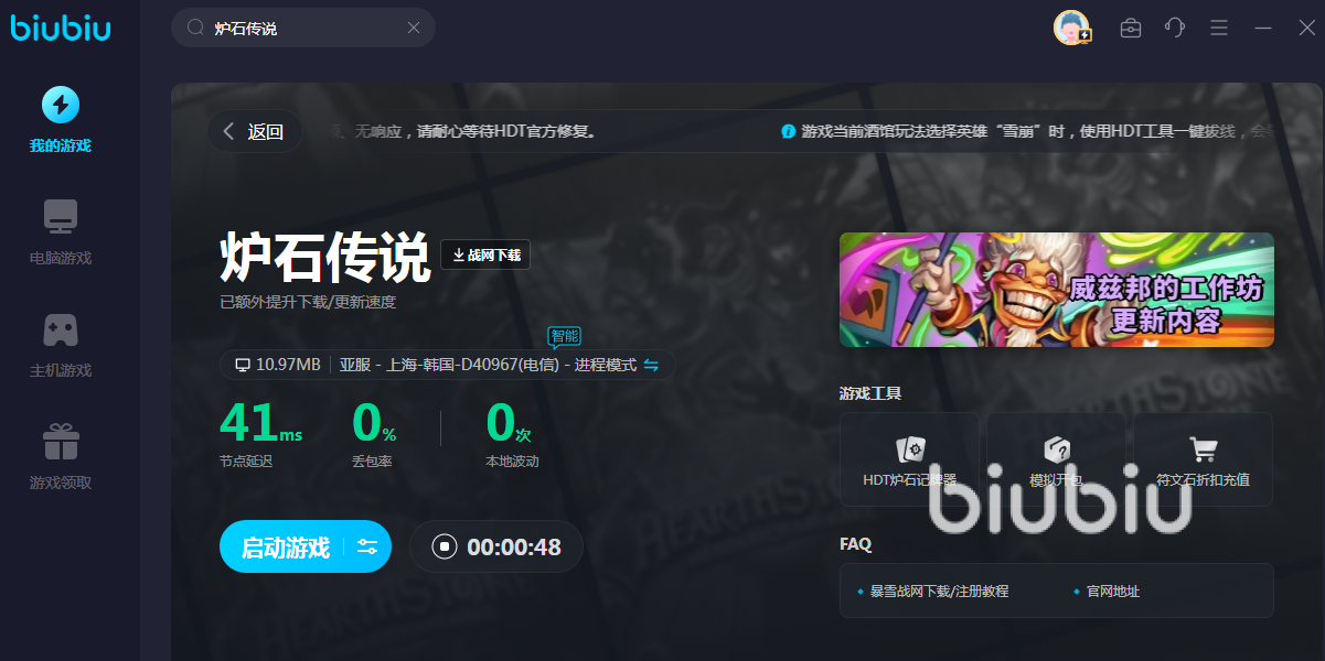 炉石传说不管是趣味性还是策略性都被玩家所认可,大家同样认可的还有biubiu加速器,很多小伙伴都选择用它来玩炉石,因为它的加速效果特别好,不仅能降低延迟,还能减少游戏内网络的波动,让大家可以专心致志地搭配卡牌研究战术,不用会被网络卡顿所打扰。因此小编也建议所有喜欢玩游戏并且有网络困扰的玩家都来使用biubiu,你们会发现有了biubiu以后延迟真的都不见了。