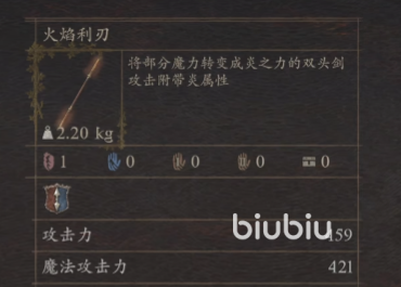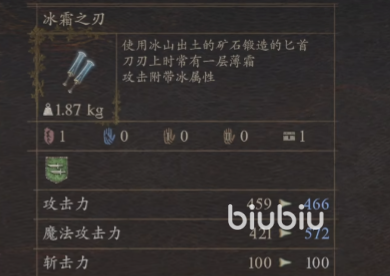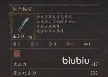 拥有417点攻击力,附带232点魔法攻击力,在没有强化的情况下属于很高的数字了。而且常驻属性是有120%的冰霜伤害,用上之后不要说是前期开荒了,强化好之后搭配上其他装备的辅助词条,一周目都可以完成通关。这么好用的装备,不需要打怪,去关口旅店的武器商人那里就可以购买了。