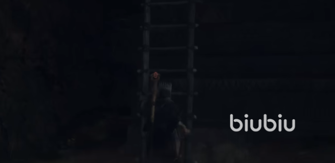 庙里面搜刮完不要急着走,直接出屋子来到外面,从右侧往建筑物的深处走,可以看到有一个梯子,靠近之后爬上去。这里比较暗一定要仔细观察才可以看到,爬到2楼梯子就没有了,就在这个平台转悠下找老婆婆。