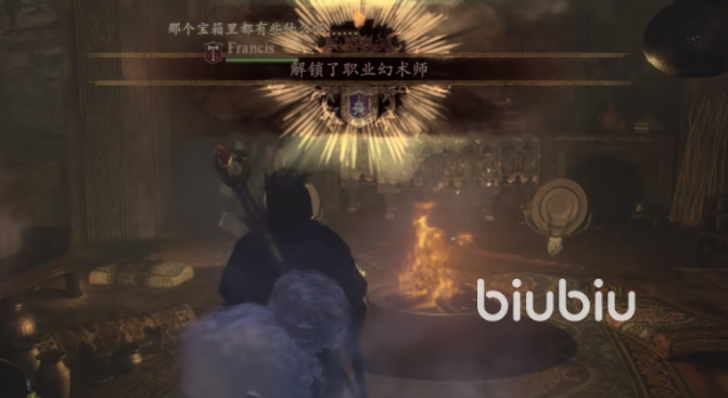 交完钱之后她会问玩家想不想知道其他人的命运,这里有闲钱就可以鉴定一下,没有就不用管了。对话完毕之后就会收到提示解锁了幻术师职业,这样玩家们就可以进行转职了。此时随从还会提示问这里宝箱有什么,等于说玩家又可以在这里搜刮一番看看有什么好东西啦。